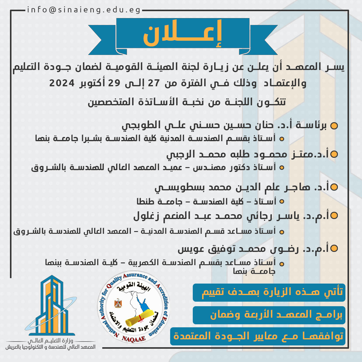 في إطار تعزيز جودة التعليم وتطوير البرامج الأكاديمية، يسر المعهد العالي للهندسة والتكنولوجيا بالعريش أن يعلن عن زيارة لجنة الجودة والاعتماد التابعة للهيئة القومية لضمان جودة التعليم والاعتماد، وذلك في الفترة من 27 إلى 29 أكتوبر 2024. تتكون اللجنة من …